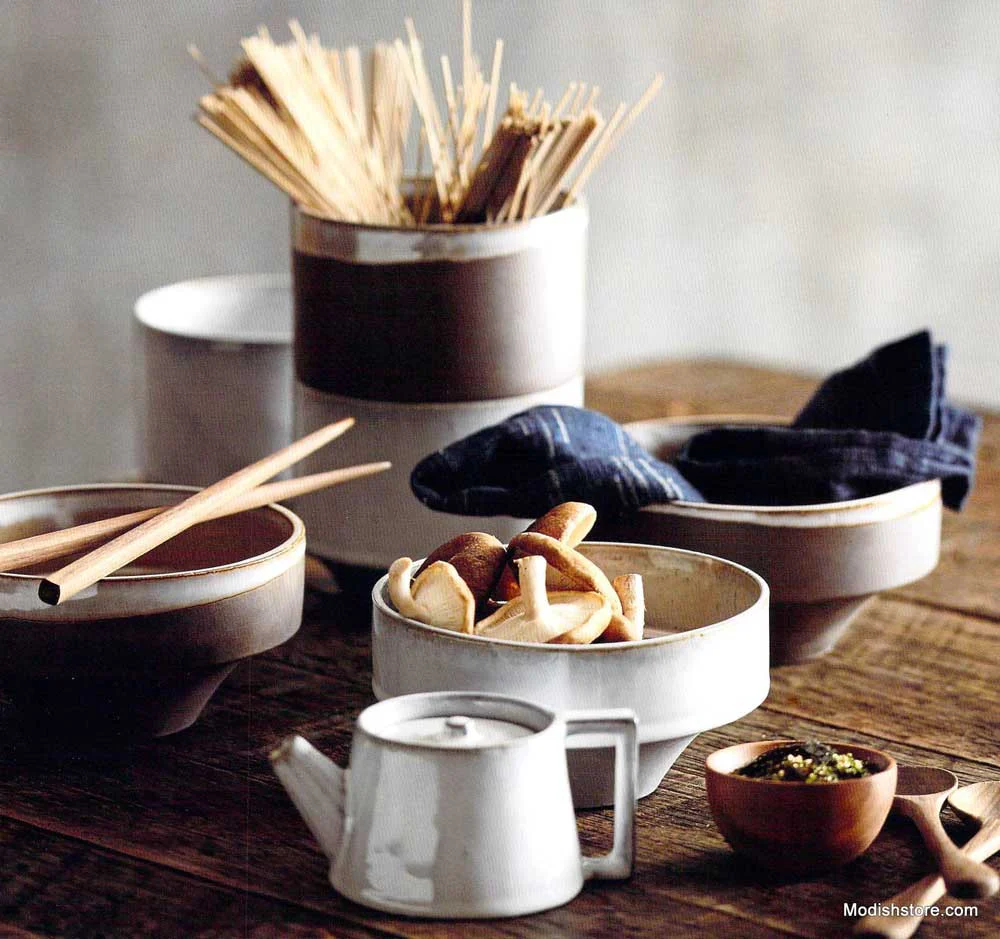 Prepare to slurp a steaming bowl of noodles in the traditional yet modern vessel crafted in stoneware. Two sizes of noodle bowls are offered in two colorations : gray clay has a translicent white glazing inside and out and an unglazed base for visual interest; brown-toned clay has a white-glazed interior and exterior top edge.