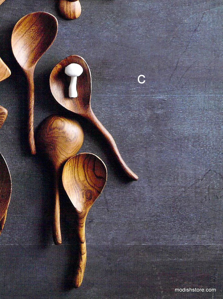 Roost Teak Wood Serveware & Utensil Collectionhas artistically shaped serveware and utensils hand-hewn from reclaimed Indonesian teak wood. A plethora of useful kitchen tools, boards, bowls and trays is carved from reclaimed teak in organic shapes that highlight the swirled grain of the wood.